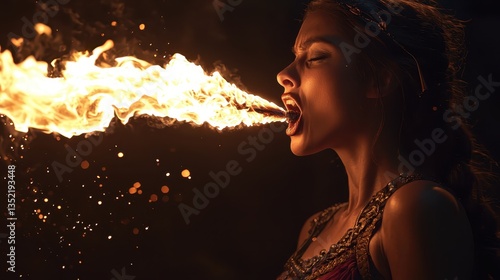 Woman breathes a stream of vibrant flames, a powerful display of inner strength and fantasy, set against a dark backdrop.