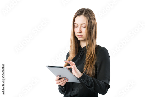 Woman business technology theme. Beautiful young caucasian woman in black shirt posing standing with tablet hands on white isolate background. Profession Marketer Sales Social Media Advertising