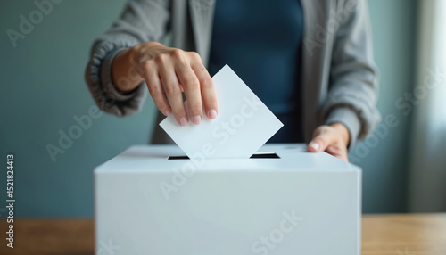 Woman casting vote ballot box. Person voting election. Civic duty in democratic society. Participation, freedom, responsibility. Close-up hand putting paper vote. Vote, choice, citizen, democracy.