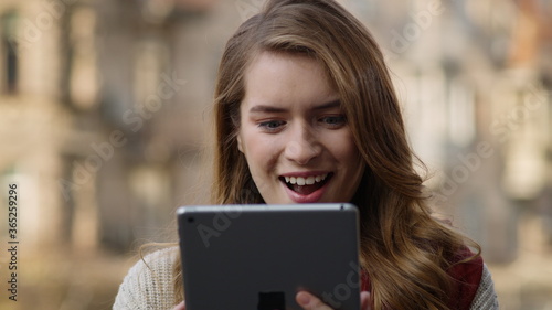 woman, tablet, girl, computer, hipster, portrait, mobile, happy, news, online, closeup, cheerful, beautiful, young, face, excited, success, looking, reading, great, message, screen, electronic mail, checking, communication, people, natural, beauty, information, digital, lifestyle, outside, background, urban, outdoors, city, street, closeup, female, person, single, day, caucasian, european, slow motion
