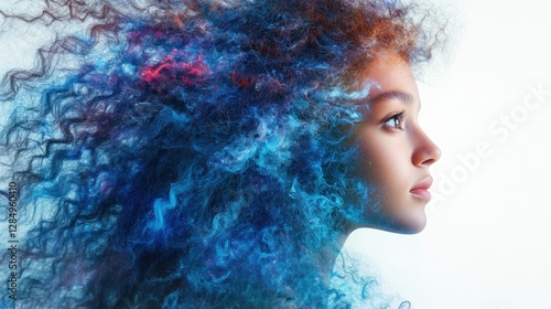woman, hair, cosmic, profile, fantasy, art, girl, beauty, portrait, style, face, model, creative, curly, colourful, imagination, dreamy, abstract, digital, artwork, illustration, design, fashion, coiffure, texture, colours, energy, light, vibrant, mystical, whimsical, magical, intriguing, unique, artistic, beautiful, modern, visionary, stylish, elegant, powerful, radiant, serene, hopeful, youthful