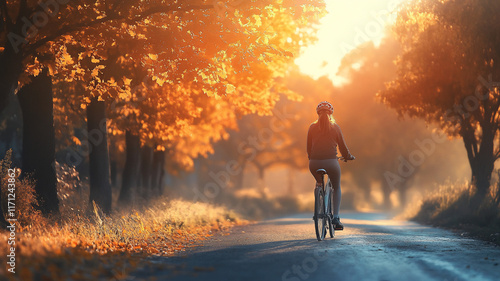 road, bicyclist, woman, autumn, sunrise, sport, bicycle, bike, cycling, speed, race, cycle, ride, fitness, helmet, biking, exercise, athlete, forest, health, outside, athletic, mountain, endurance, transportation, energy, activewear, team, travel, sun, racing, leisure, track, young