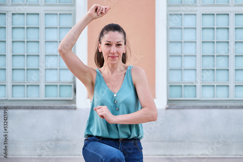 woman, dance, street, authentic, jazz, solo, person, motion, adult, swing, alone, 40s, freckle, music, one person, caucasian, spanish, blue, female, happy, smile, enjoy