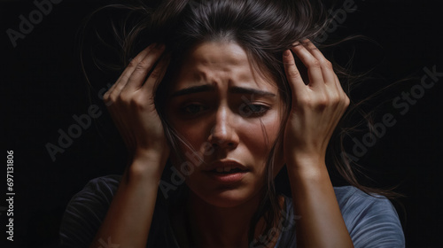 woman, distressed, dark, room, emotional, portrait, hand, hair, anxiety, despair, powerful, expression, face, grieved, intense, fear, worry, pain, sorrowful, alone, troubled, stress, dramatic, adult, human, psychological, mood, grief, concern, upset, darkness, helplessness, crisis, female, pensive, thoughtful, desperate, anguish, serious