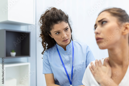 Woman doctor osteopath in medical uniform fixing woman patients shoulder and back joints in manual therapy clinic during visit. Professional osteopath during work with patient concept