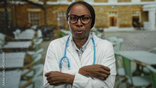 Woman doctor standing outdoors at a terrace restaurant wearing a white coat and glasses with a stethoscope visible against a background of empty tables and brick buildings.
