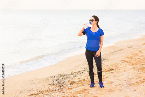 beach, runner, woman, girl, fitness, athlete, sport, healthy, lifestyle, sea, ocean, nature, physical exercise, caucasian, outdoors, copy space, activewear, water, bottle, drink, young