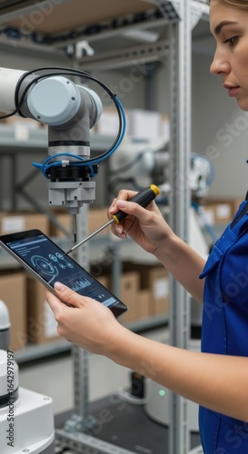 woman, engineer, robot, tablet, programming, factory, automation, industry, technology, arm, production, storage, screwdriver, innovation, caucasian, men at work, future, industrial, smart, artificial, intelligence, mechanical, engineering, machinery, digital, manufacturing, development, science, precise, machine, modern, control, job, skilled, profession, warehouse, workplace, uniform, blue, collar, professional, technician, expert, repair, service, maintenance, setting, adjustment, system