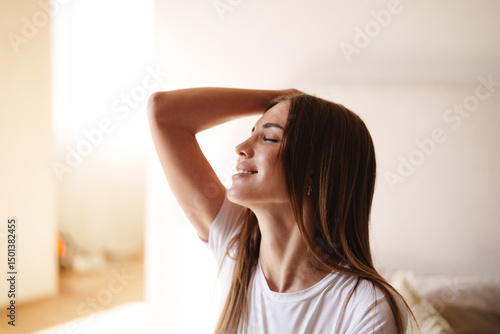 Woman enjoying a moment of relaxation at home during the morning sunlight