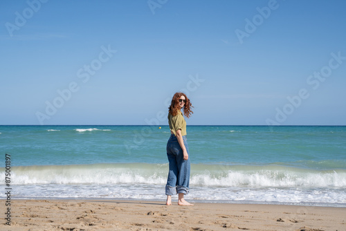 beach, woman, sea, sand, horizon, nature, serenity, casual attire, style, ocean, coastline, shore, sunny, daylight, relaxation, tranquil, leisure, travel, vacation, peace, calm, contemplation, reflective, alone, solitude, freedom, escape, summer, waterside, tranquil scene, casual clothes, stylish, natural light, sky, clear sky, standing, adult, female, sunlight, blue, water, scenic, beauty, half face, sunglasses