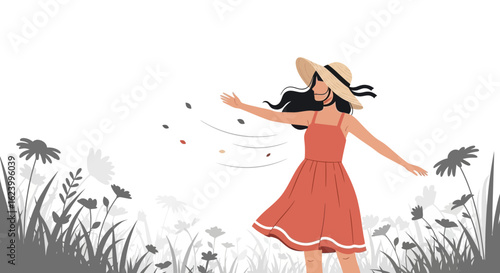 woman, summer, meadow, floral, nature, girl, field, freedom, carefree, happiness, dress, hat, sunlight, idylli, peaceful, breeze, outdoors, tranquil, relax, young, lifestyle, spring, blossom, casual attire, elegant, female, joy, romance, romantic, wanderlust, vacation, holiday, countryside, sunny, wind, season, botanical, wellness, harmony, relaxation, illustration