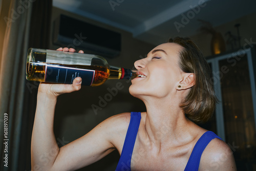woman, whiskey, home, dancing, music, alcohol, bottle, relaxation, joy, drink, celebration, happiness, drinking, home, enjoyment, fun, lifestyle, leisure, spirit, casual attire, evening, beverage, indoor, female, adult, party, unwind, smile, entertainment, blue, dress, sip, social, spontaneous, carefree, moment, cheerful, dance, vibe, living, room, half face