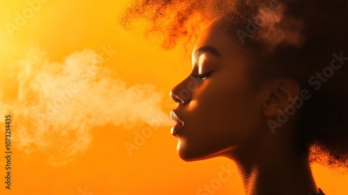 woman, smoke, emanating, hair, afro, face, portrait, silhouette, studio, background, light, gold, yellow, orange, dark, contrast, art, beauty, fashion, style, model, pose, eyeliner, lip, skin, eye, closed, female, person, human, profile, head, neck, shoulder, ear, body, lighting, dramatic, photo
