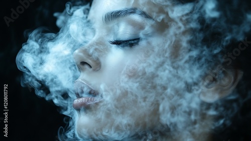 woman, face, vapour, smoke, emanating, breathing, beauty, model, portrait, mysterious, sensual, alluring, enigmatic, dark, shadowy, hazy, cloudy, abstract, artistic, moody, elegant, sophisticated, aethereal, dreamy, captivating, intense, serene, calm, peaceful, eye, lip, nose, skin, texture, light, shadow, contrast, atmosphere, feeling, emotion, expression, visual, art, photo