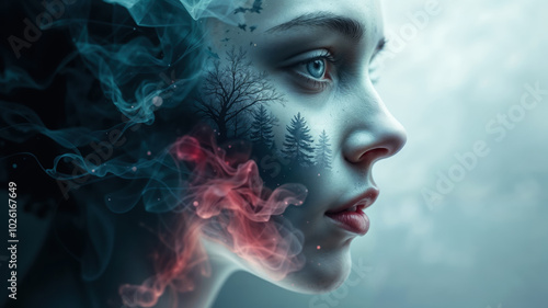 woman, face, forest, nature, sunset, merge, double exposure, connection, environment, surreal, art, portrait, beauty, spirituality, harmony, serene, calmness, aethereal, mystical, dreamlike, imagination, fantasy, abstract, conceptual, digital artwork, illustration, blue, green, pink, glow, smoke, tree, landscape, cloud