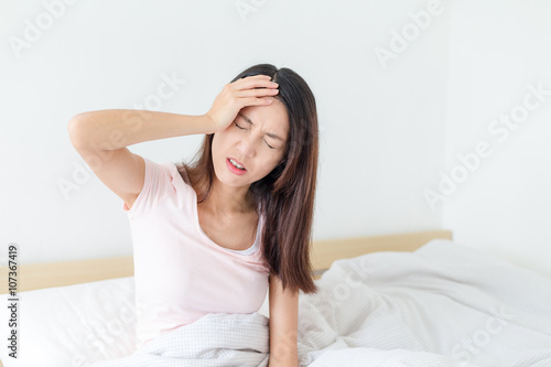bed, room, bedchamber, living, home, house, bedtime, rest, to sit, woman, girl, female, people, japanese, korean, asia, asian, 1, pink, rose, tee, wear, morning, early, arousing, up, flu, disease, pained, pain, painful, sick, flu, weather, severe, stress, problem, bad, disease, suffer, ache, hurting, medicals, unwell, head, intense, treatment, weakness, depression, cephalalgia