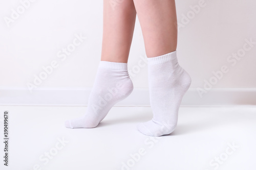 Woman female legs wearing white plain cotton socks of classic style with elastic band standing against white background