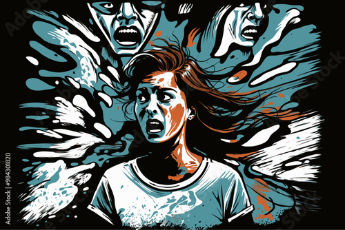 woman, frightened, anxiety, mental, health, disorder, cartoon, illustration, design, graphic, emotional, distress, vulnerability, visual, contemporary, clean, psychological, expressive, fear, modern, abstract