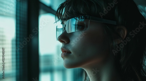 woman, profile, goggles, futuristic, transparent, eyewear, modern, technology, female, face, hair, bang, brunette, side, view, window, city, urban, building, city landscape, light, shadow, teal, blue, green, tone, moody, thoughtful, expression, serious