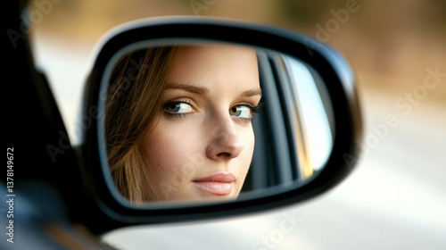 woman gazes thoughtfully into side mirror of car, reflecting moment of introspection and contemplation. soft lighting enhances her features, creating serene atmosphere