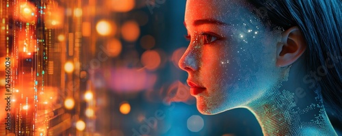 woman, futuristic, city landscape, neon, light, datum, technology, digital, girl, portrait, science, fiction, ai, artificial, intelligence, network, future, innovation, progress, modern, abstract, cyber, space, cosmos, glowing, vibrant, colourful, energy, power, fantasy, surreal, mysterious, enigmatic, beauty, style, face, profile, night, city, background, texture, graphic, illustration
