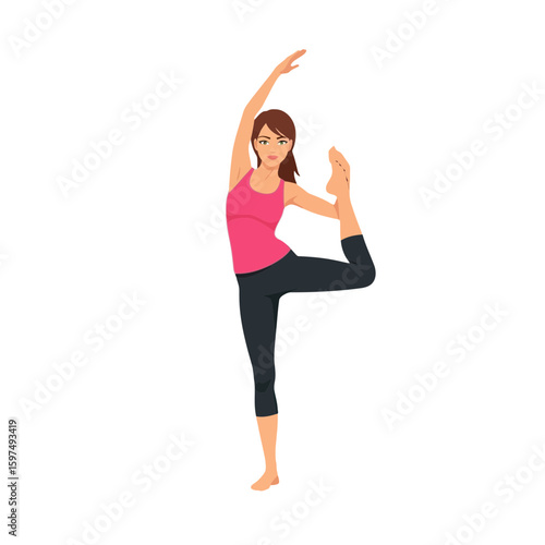 yoga, pose, woman, girl, female, fitness, exercise, healthy, well-being, lifestyle, sport, athletic, active, posture, balance, flexibility, strength, body, leg, arm, hand, foot, graceful, elegant, calm, serene, concentrated, focused, mindful, wellness, practice, asana, physical exercise, training, studio, indoor, illustration, cartoon, drawing, graphic, design, pink, black, apparel, clothing, top, pant, leggings