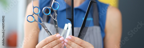 Woman hairdresser holding combs and scissors for hair cutting closeup