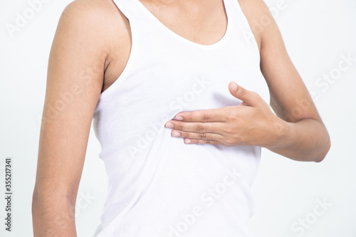 Woman hand checking lumps on her breast for signs of breast cancer on gray background. Healthcare concept.