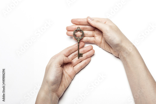 woman hand hold a vintage key isolated white.