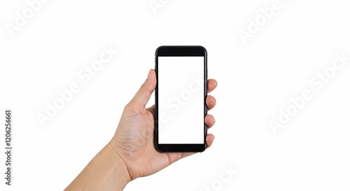 Woman hand holding phone on white background with copy space. Woman holding smartphone with white screen. Hand with blank cellphone display, close-up