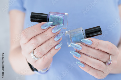 Woman hand with long nails manicure and light lilac and blue nail polish