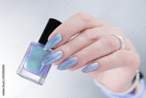 Woman hand with long nails manicure and light lilac and blue nail polish