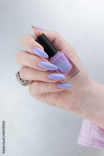 Woman hands with long nails manicure and light blue lilac pink nail polish