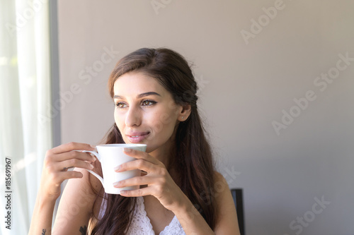 Woman having coffee and smile. Beautiful white woman having her morning coffee and smile looking very happy.