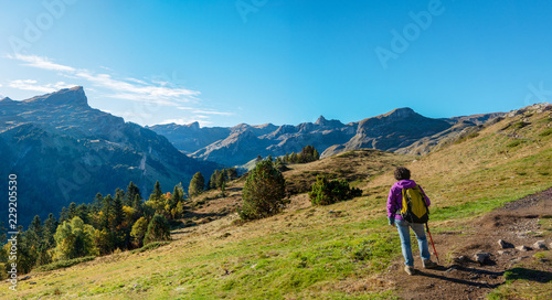woman hiker walking in the Pyrenees mountains near the Pic Ossau