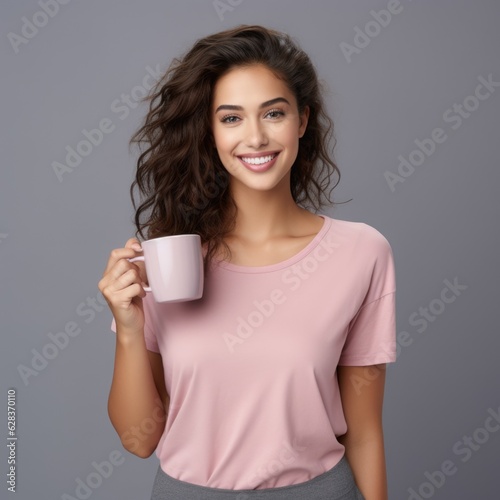 hot drink, cup, mug, drink, person, drinking, people, smiling, relaxed, product, t-shirt, shirt, model