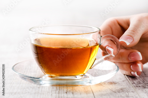 Woman holding a glass cup of black tea. Hot tea in beautiful cup with woman fingers and perfect french nails.