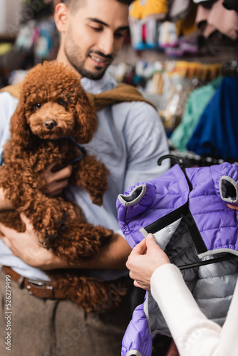Woman holding animal jacket near blurred muslim boyfriend with poodle in pet shop
