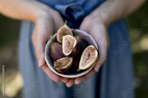 woman, hand, adult, caucasian, hold, bowl, fig, fruit, slice, fresh, selective focus, outdoors, day, 1, people, food