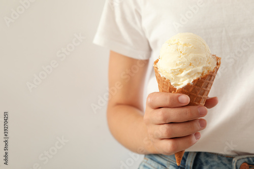 Woman holding ice cream in wafer cone on light background, closeup. Space for text