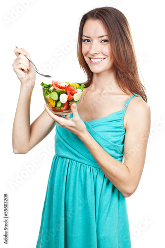 20s, attractive, beautiful, brunette, casual attire, caucasian, cheerful, colours, cucumber, dieting, domestic, dress, egg, european, female, food, fork, fresh, freshness, glasses, happiness, health, healthy eating, healthy lifestyle, holding, isolated on white, meal, one person, pepper, plate, salad, smiling, studio shot, tomatoes, vegetable, vegetarian, vertical, woman, young adult