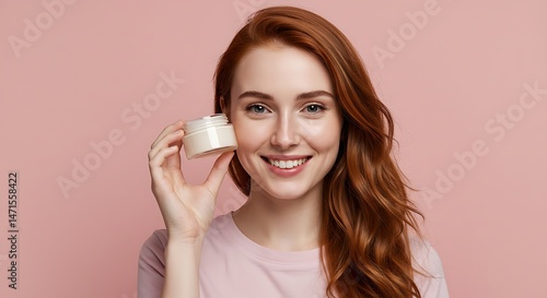 woman, hold, product, smile, beautiful, happy, pretty, casual attire, modern, studio, day, skin, face, hair, eye, hand, cream, jar, container, person, cosmetic, skincare, health, beauty, treatment, lifestyle, care, female, portrait, background, pink, 1, caucasian, adult, usage
