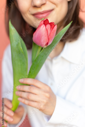 Woman holding spring pink tulip flower in her hands on pink background. Close up