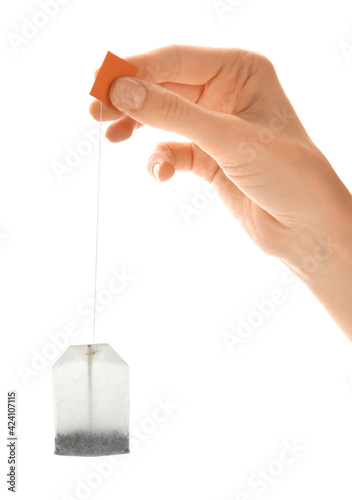 Woman holding tea bag on white background