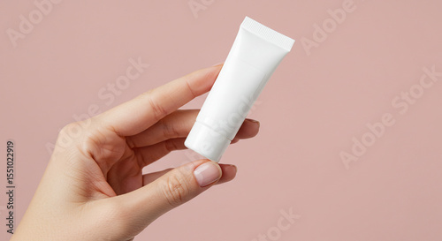 Woman holding white cosmetic cream tube mockup on pink