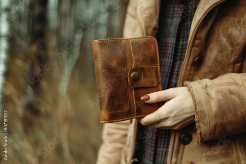 Woman holds a brown genuine leather wallet a beautiful and practical accessory
