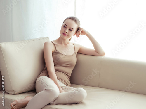 Woman home portrait sofa relax female indoors portrait