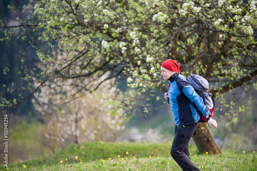 Woman in a red scarf on her head and blue jacket dresses the backpack on top of hill with blooming tree and forest valleys as blurred background.