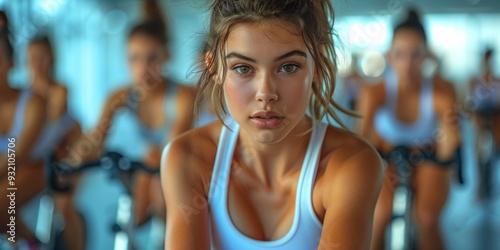 woman, spin, class, fitness, exercise, physical exercise, gym, studio, bike, cycling, indoor, training, athletic, sport, active, healthy, lifestyle, motivation, determination, energy, intense, focused, effort, group, people, instructor, perspiring, muscle, strength, cardio, endurance, young, white, tank, top, blond, hair, eye, look, camera, pose, close, up, blurry, background, light, bright