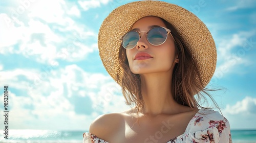 Woman in a Straw Hat and Sunglasses Gazing at the Sky